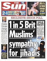The Guardian bashes the Sun in a leader: "Terrorists only win if they force us to abandon our way of life and instead live in terror. What better way to do their work for them than to make up a story that leaves Britons believing that 20% of a particular community wants to blow them up."